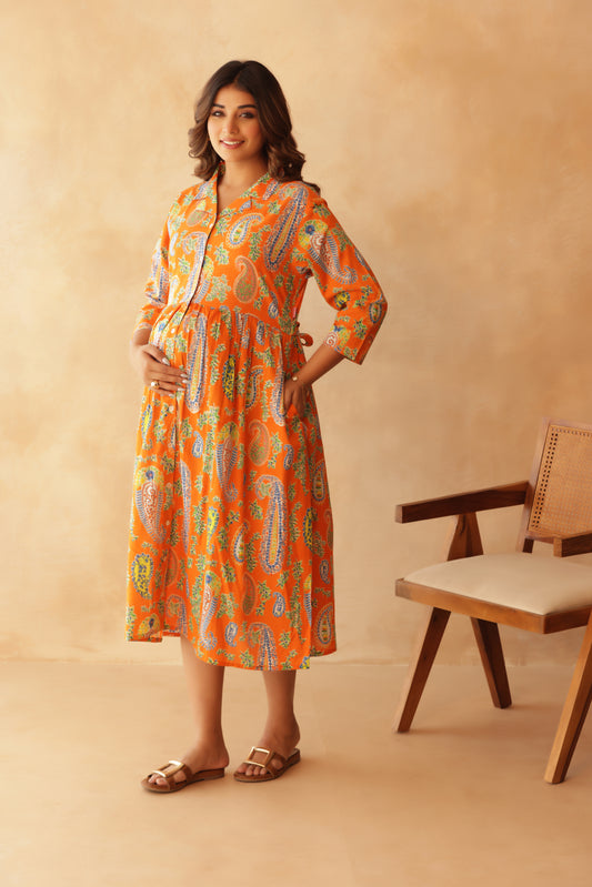 Tangerine Paisley Buttoned Maternity & Nursing Dress