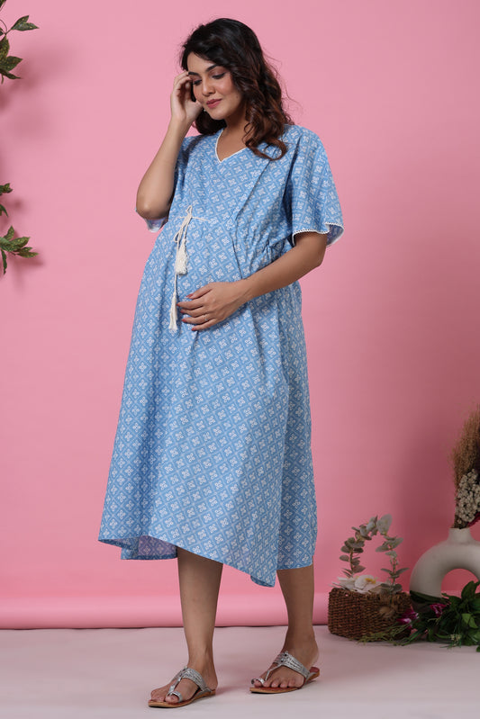Patterned Bandhej Blue Maternity & Nursing Kaftan Dress