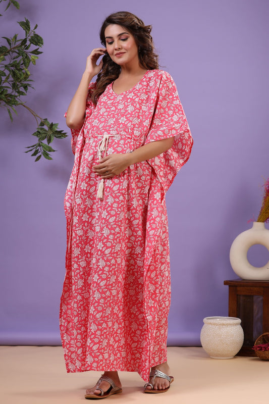 Patterned Bandhej On Pink Maternity & Nursing Kaftan
