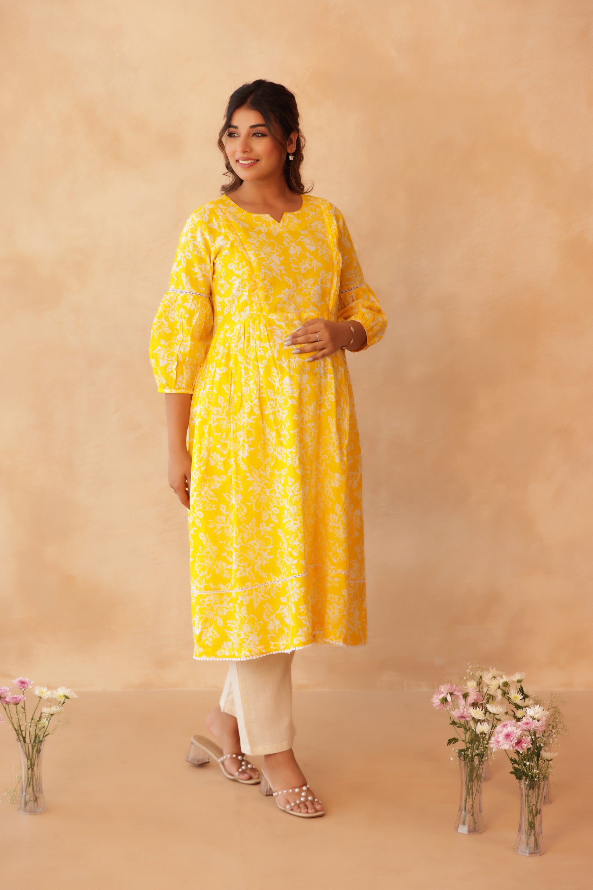 Designed with discreet concealed nursing zippers, this kurta allows for effortless and comfortable breastfeeding, making it ideal for both pregnancy and postpartum wear. The soothing yellow base with delicate white floral prints adds a fresh, elegant touch, perfect for everyday wear, casual outings, baby showers, and summer days.