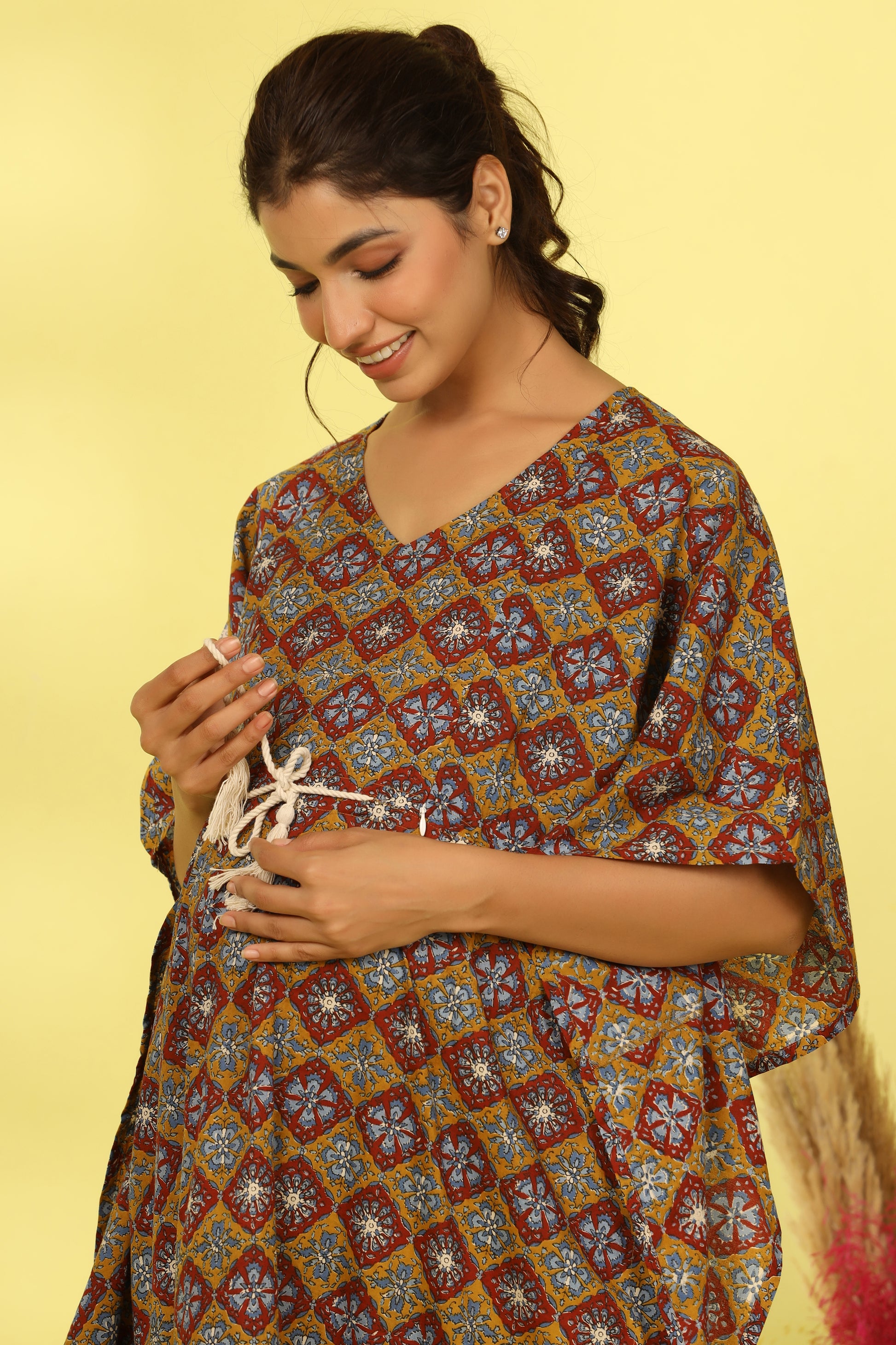 Get ready to relax in style with our Mughal Coromandel Maternity & Nursing Kaftan! Made from soft and comfortable fabric, this kaftan features a unique floral print, perfect for adding a touch of personality to your maternity collection. With a convenient feeding design, this kaftan combines comfort and functionality. Never sacrifice comfort for looks again!
