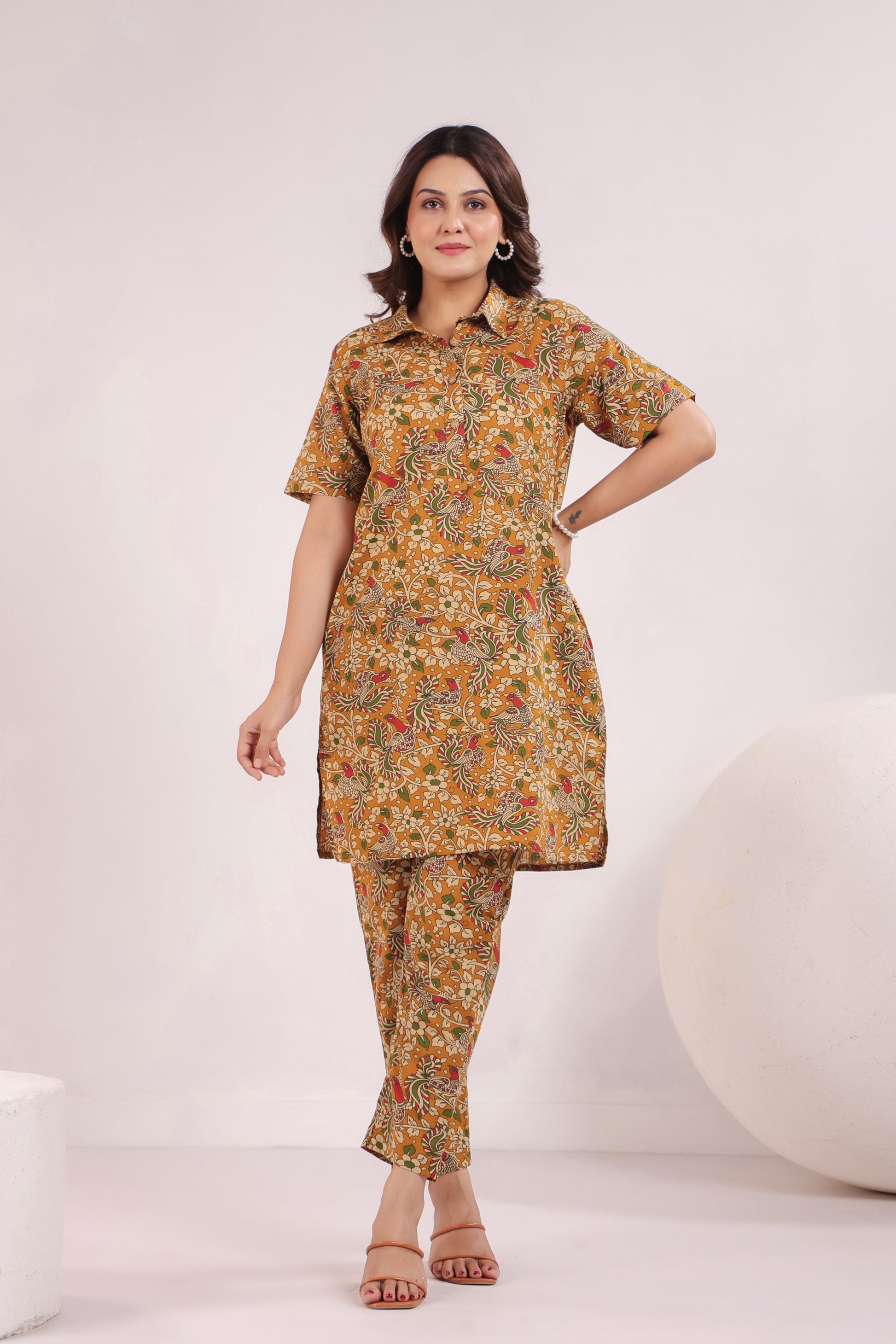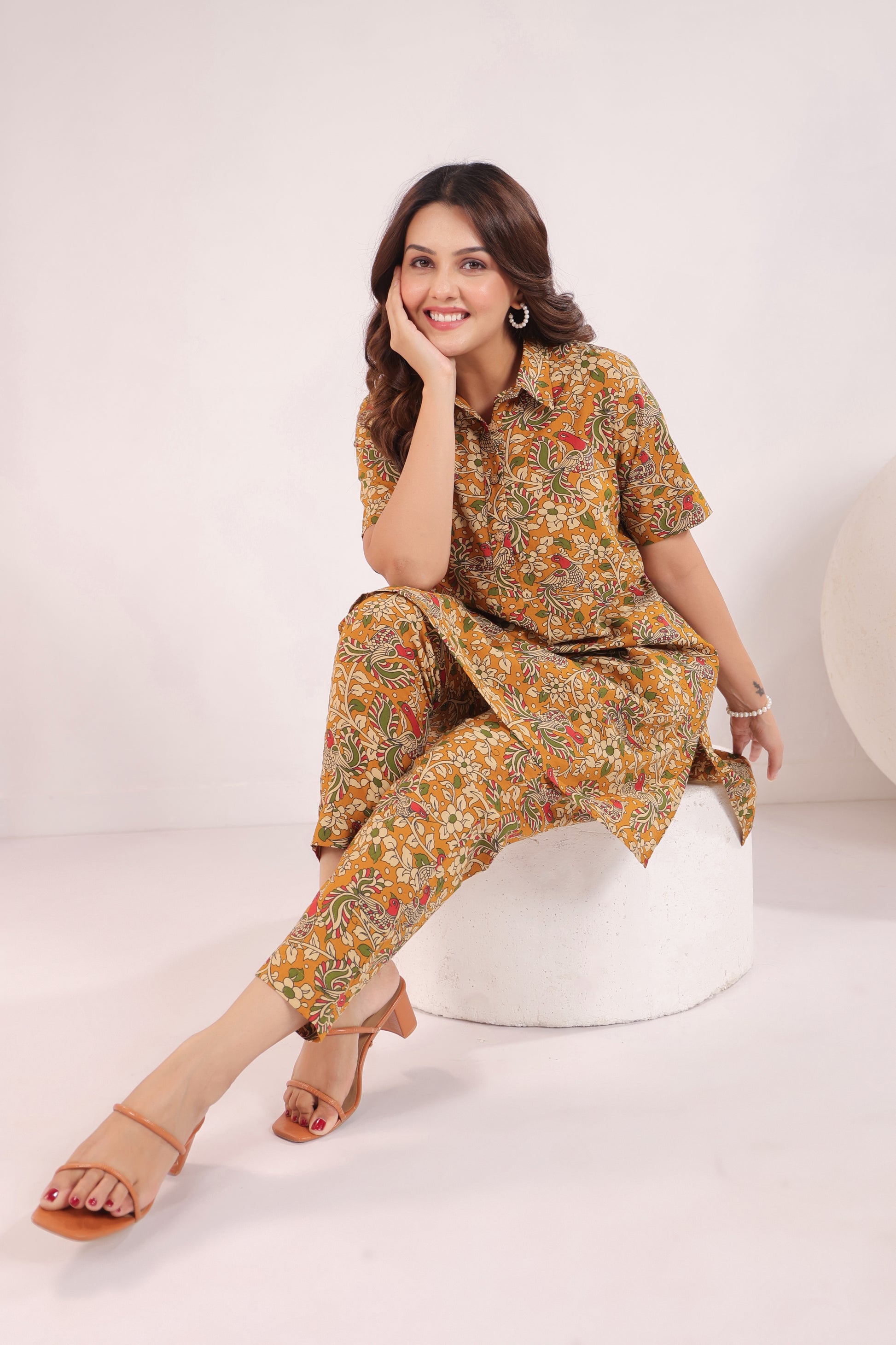 Bring out your wild side with Mustard Kalamkari Cotton Co-ord Set! Made with comfortable fabric. Perfect for lounging or a casual day out, it's the ultimate combination of style and comfort.